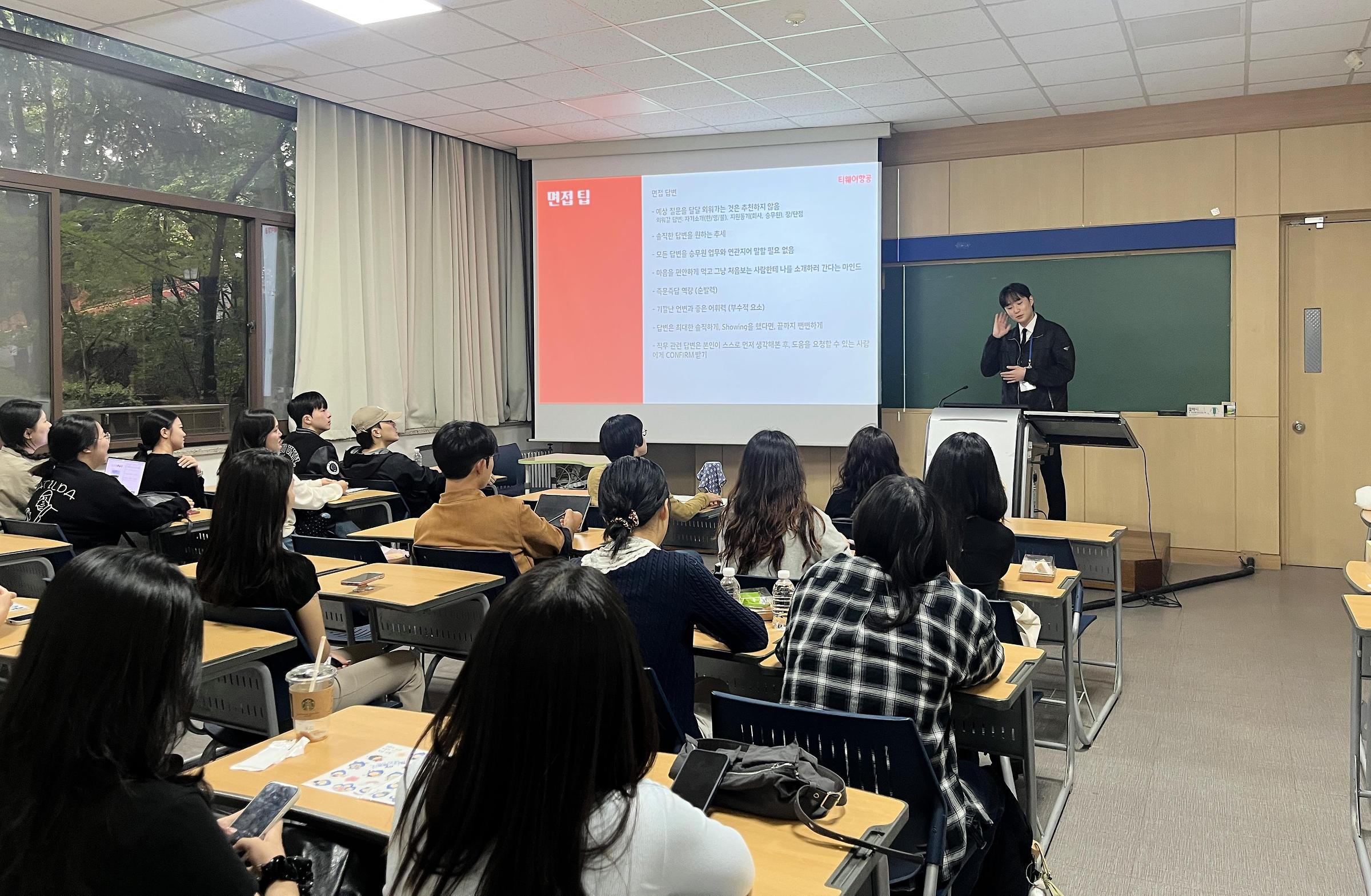 인문대 졸업 동문 멘토가 본인의 노하우를 후배들에게 전하고 있다