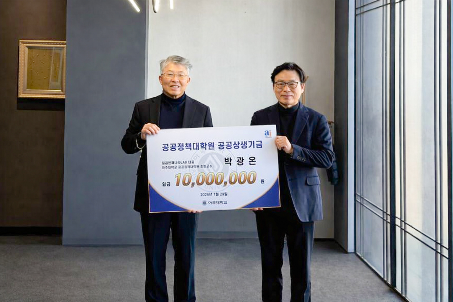 제19~21대 국회의원(수원정)을 지낸 박광온 기부자는 우리 학교 공공정책대학원 초빙교수로 재직 중이며, 일곱번째나라LAB 대표를 맡고 있다. 박광온 기부자는 ‘공공정책대학원 공공상생기금’으로 1000만원을 쾌척했다. 박 교수는 지난 2024년부터 우리 학교 공공정책대학원에 초빙교수로 임용되어 후학을 양성하고 있다.
