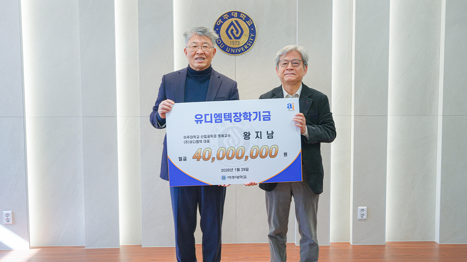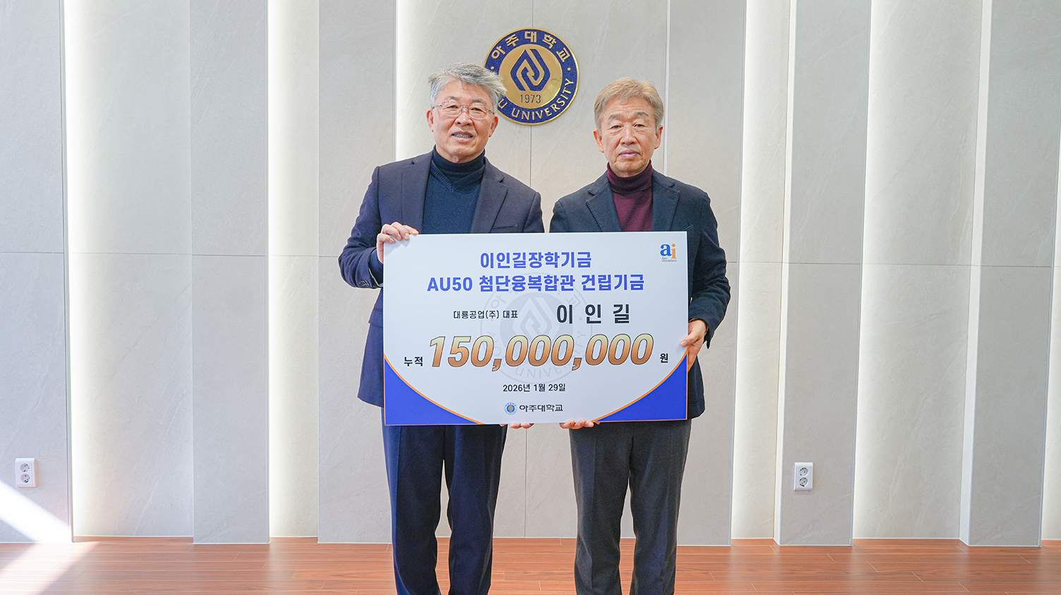 ㈜대룡공업 대표 이인길 기부자는 아주대 화학공학과 동문(73학번)으로 아주대 총동문회 5·6대 회장을 역임했다. 이번 기부금 전달식에서 이인길 기부자는 화학공학과를 비롯한 이공계열 학생들을 위해 ‘이인길 장학기금’으로 5000만원을 기부했다. 이인길 대표는 지난 2023년부터 ‘AU50 첨단융복합관 건립기금’ 기부를 이어왔고, 누적 기부금은 총 1억5000만원에 달한다.