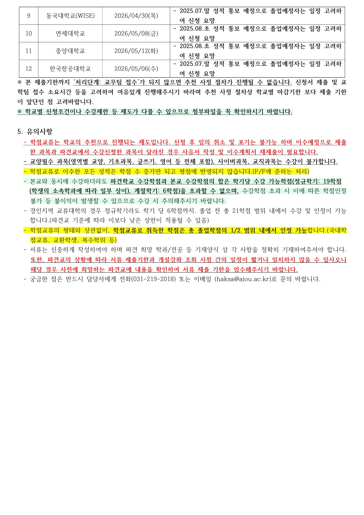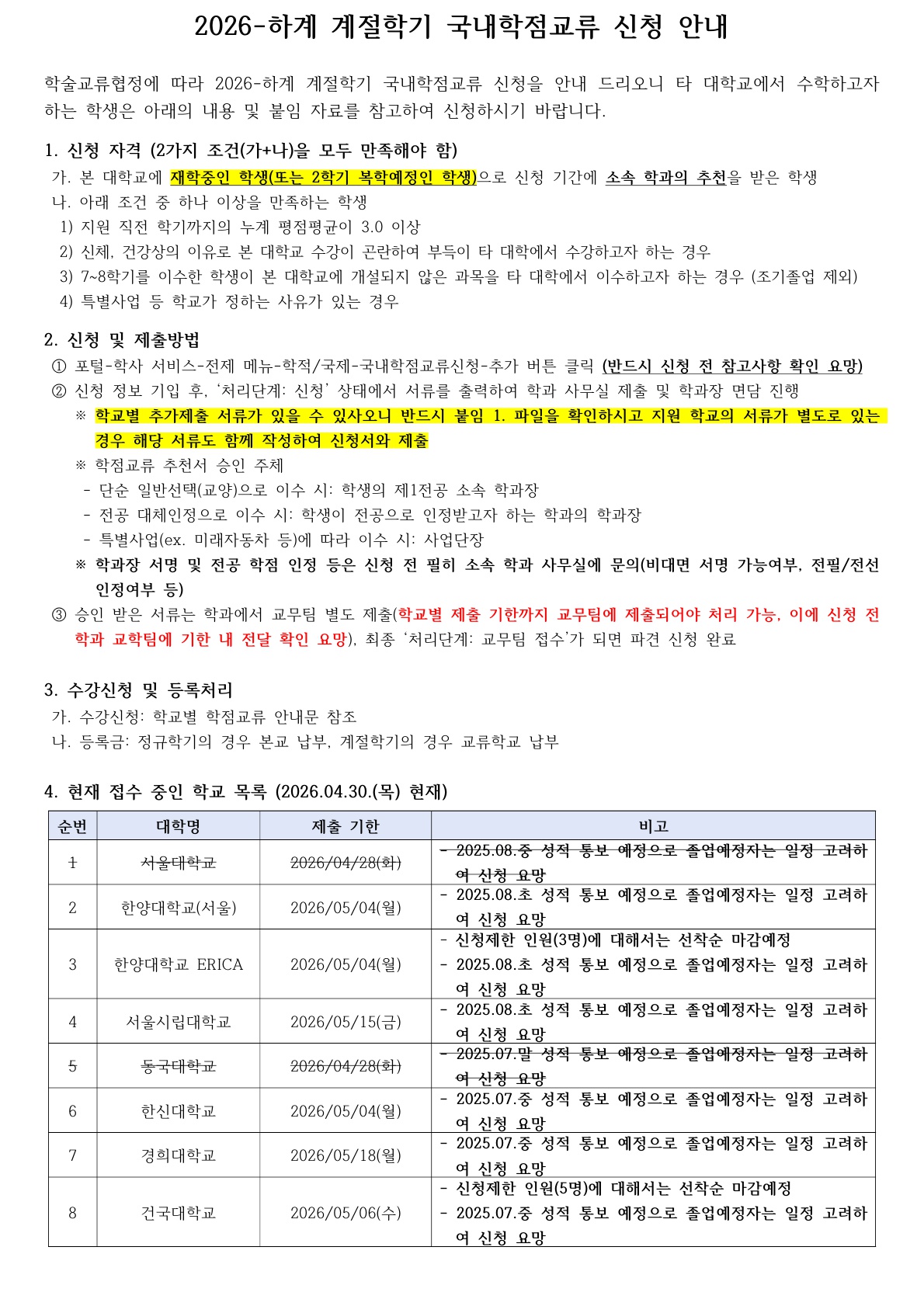 [학사] [학부/학사과정] (26.04.30.) 2026-하계 계절학기 국내대학 학점교류 신청 안내