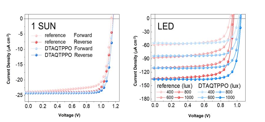 [새롭게 개발한 계면소재(DTAQTPPO) 적용 페로프스카이트 태양광전지는 (좌측)태양광에서의 효율은 22.29%에서 23.55% (우측) 실내 조명 환경에서는 31.19%에서 37.18%로 향상됐다]