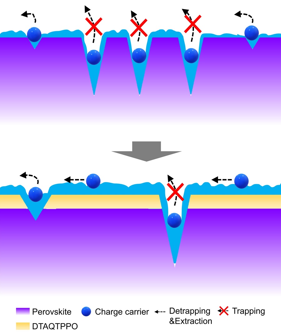 [새로 개발한 계면소재(DTAQTPPO)가 전하의 이동을 방해하는 페로브스카이트 표면의 결함을 제거해 태양전지의 에너지 변환효율을 높였다]