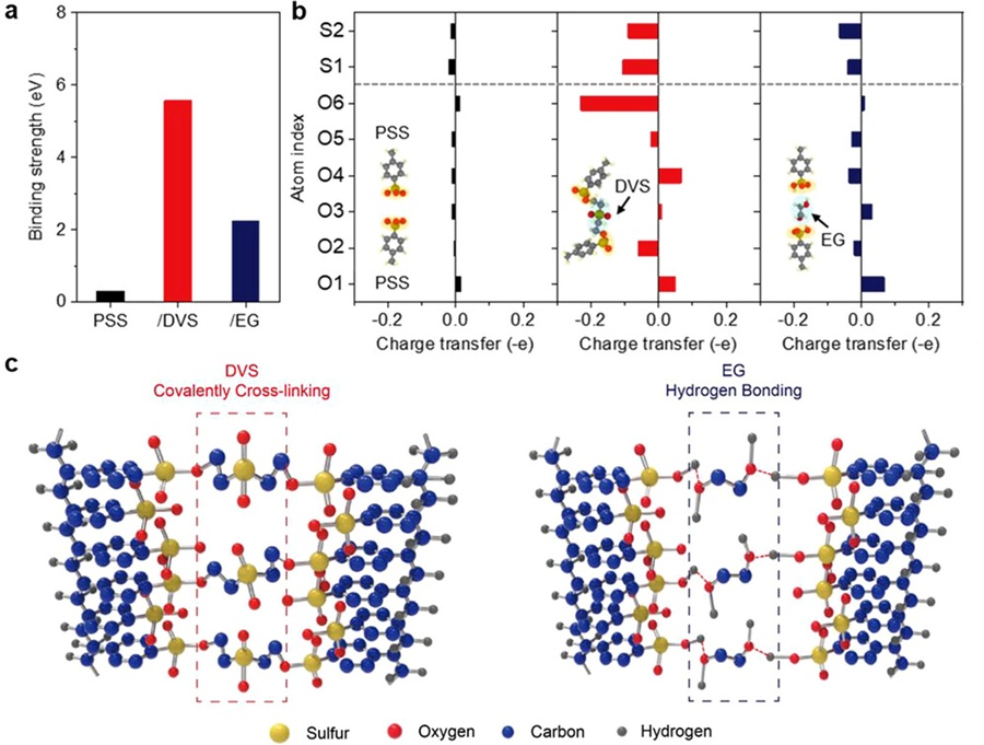 전도성 고분자인 PEDOT:PSS 소자는 음전하를 띄는 PSS 덕분에 양이온 흡착이 가능해 전기 생산 성능을 극대화할 수 있지만 PSS의 친수성 때문에, 수분에 대한 안정성이 낮다는 한계가 있었다. 이에 연구팀은 가교제로 사용되던 EG(Ethylene glycol, 에틸렌글리콜) 대신 DVS(Divinyl sulfone, 디비닐술폰)을 사용해 수소결합보다 강력한 공유결합이 가능함을 확인했다.